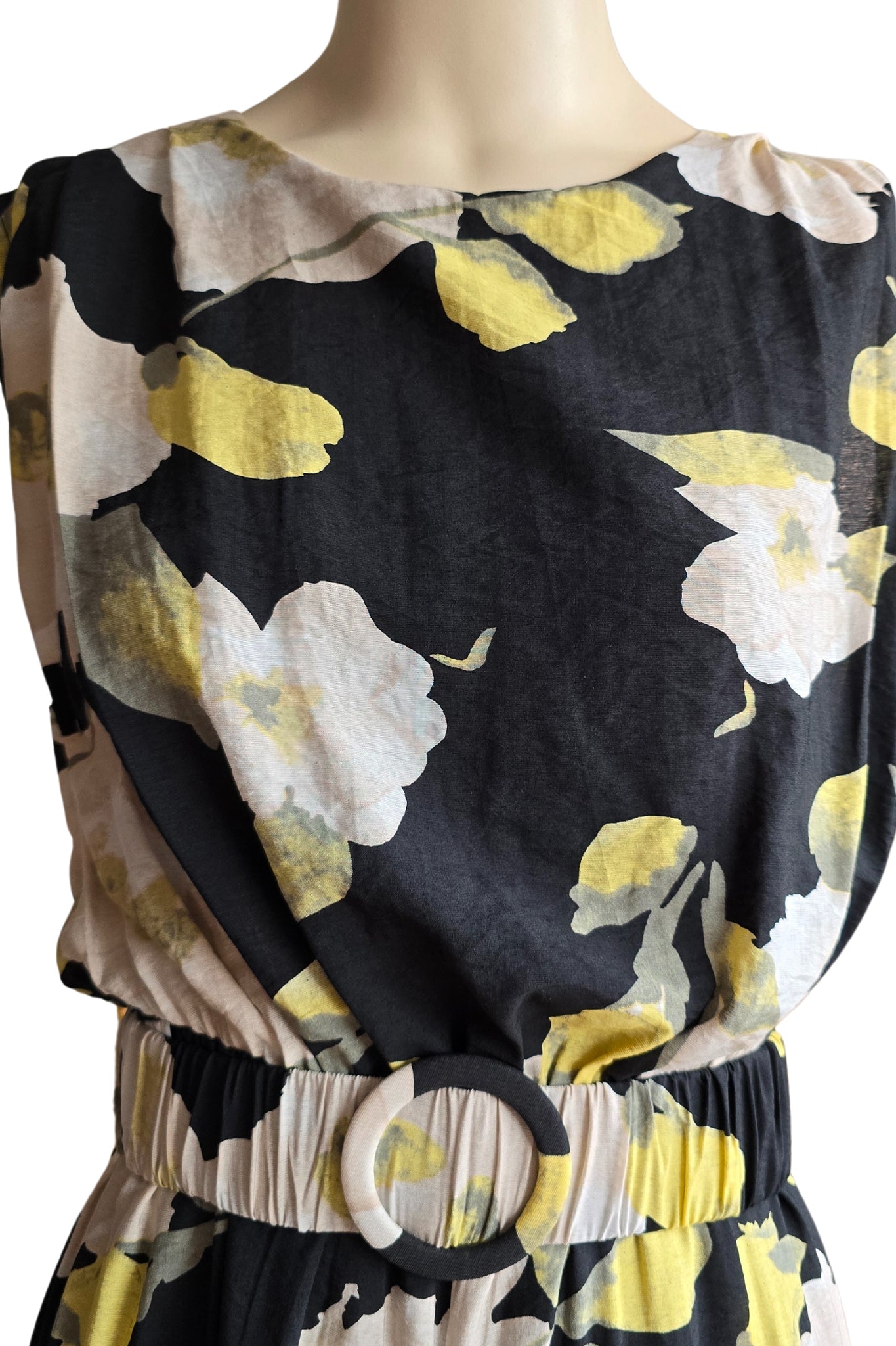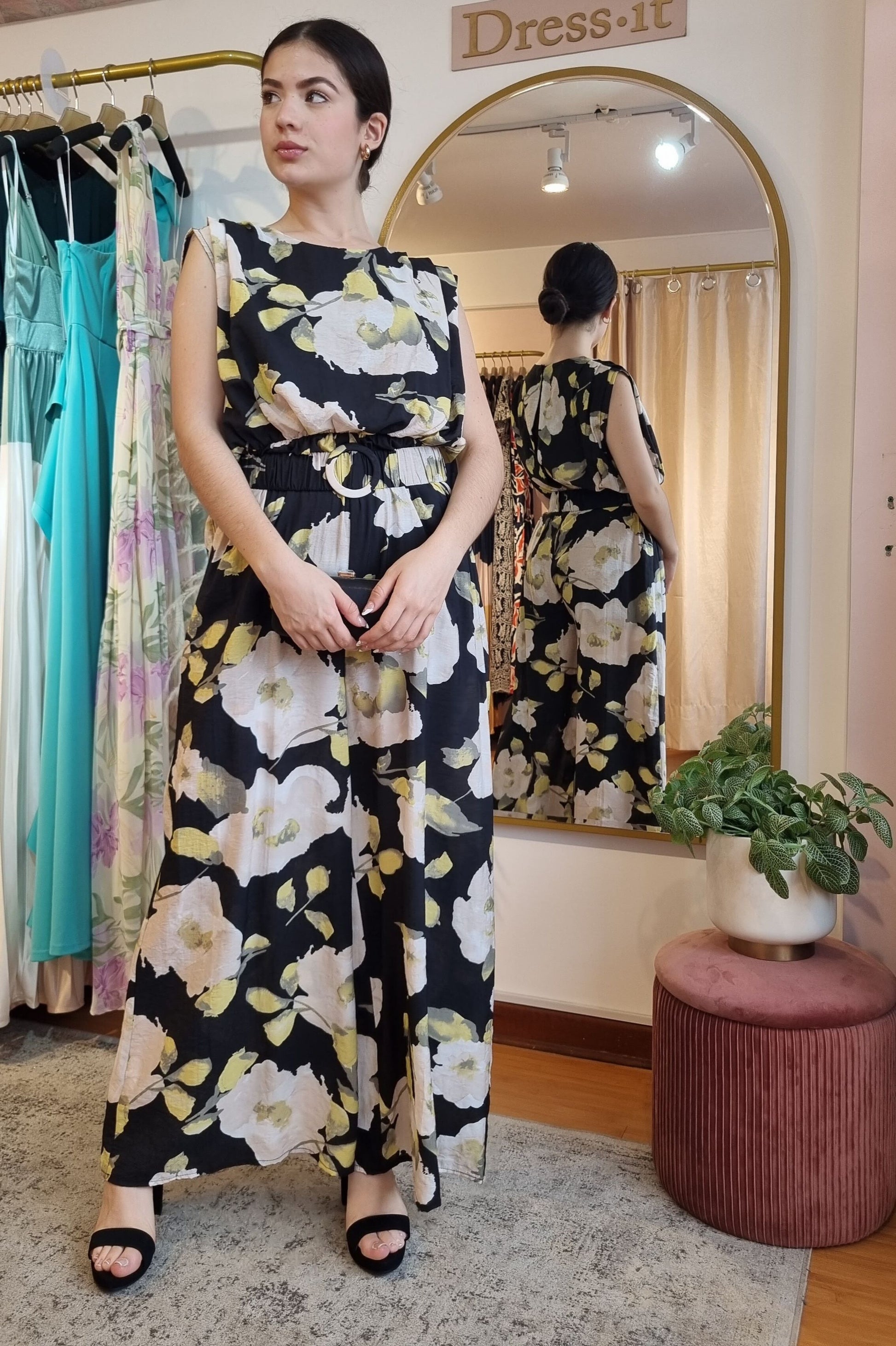 • Enterizo largo de tela estampado con cinturón de la misma tela.