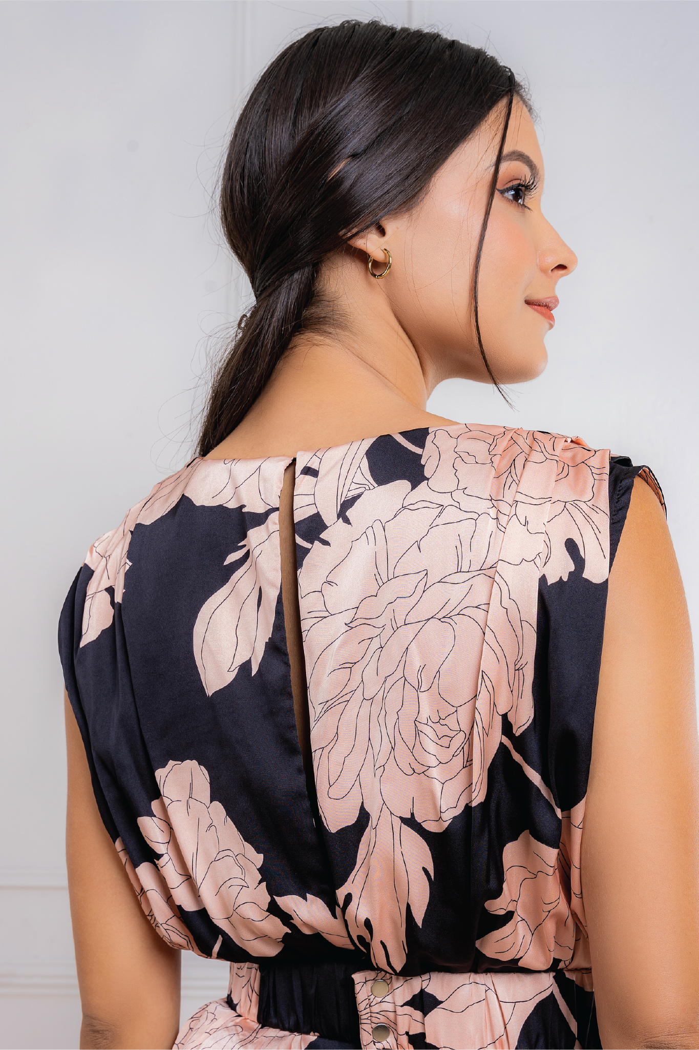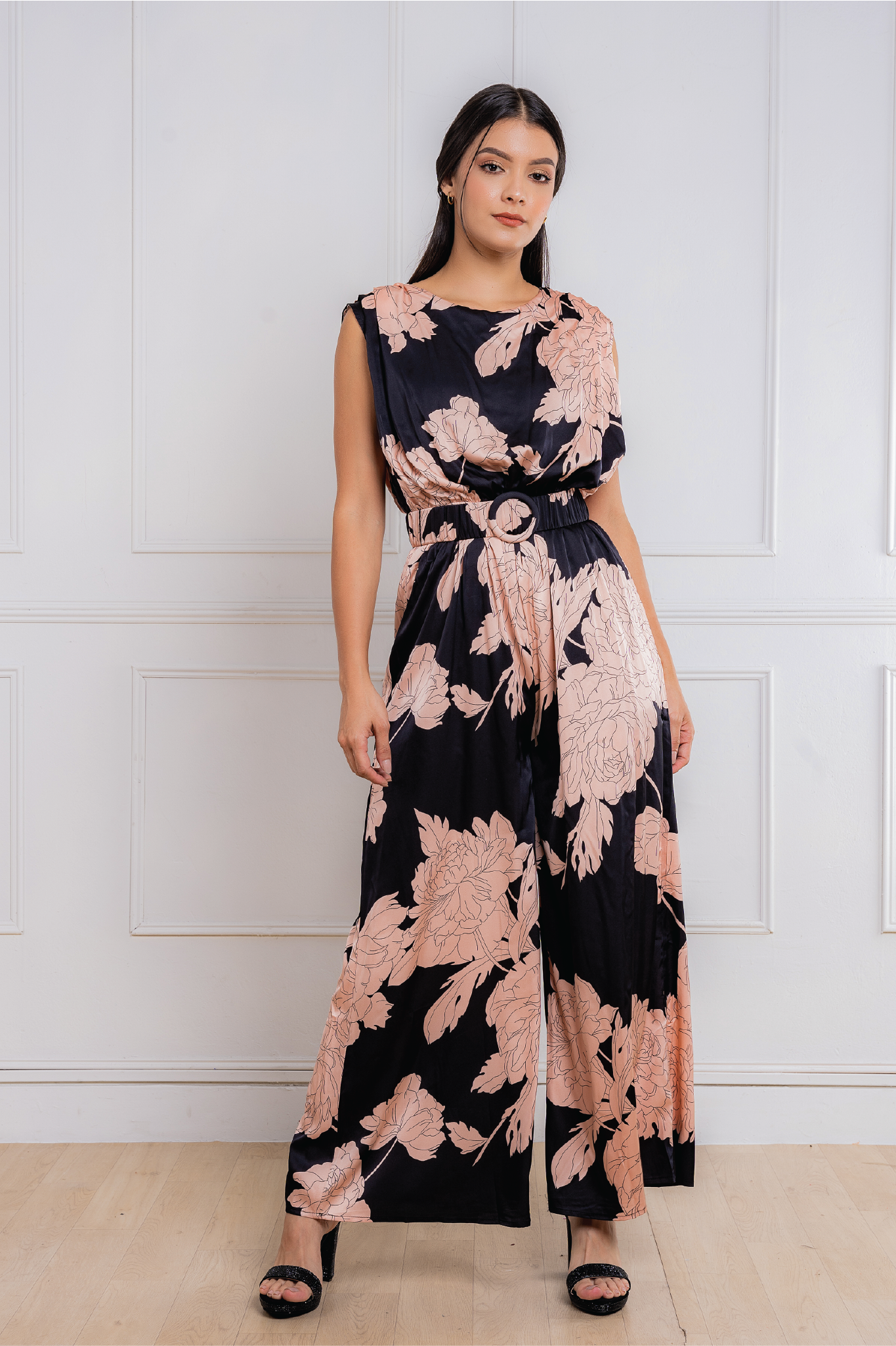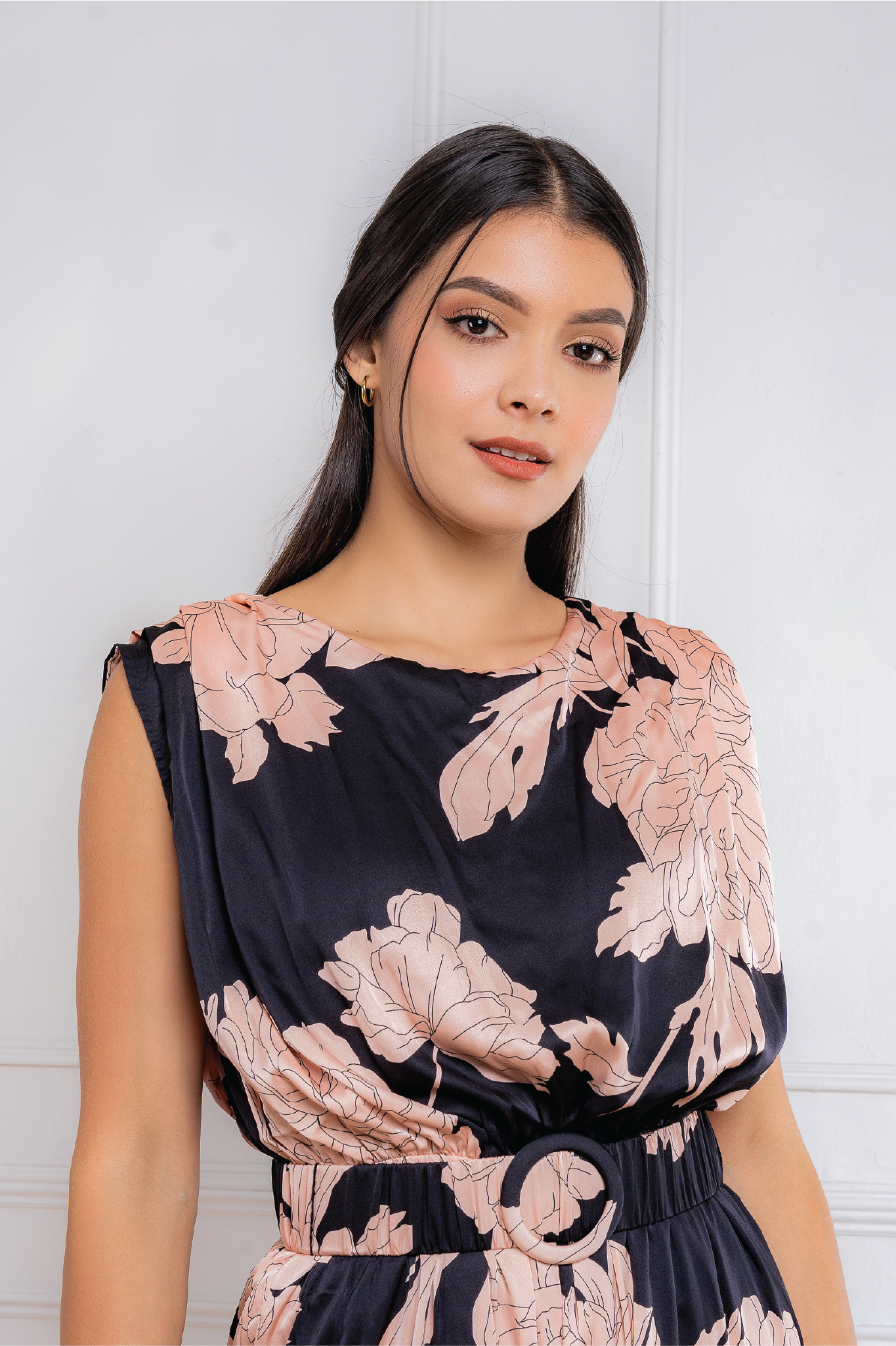 • Enterizo largo de seda satinada estampada con cinturón de la misma tela.