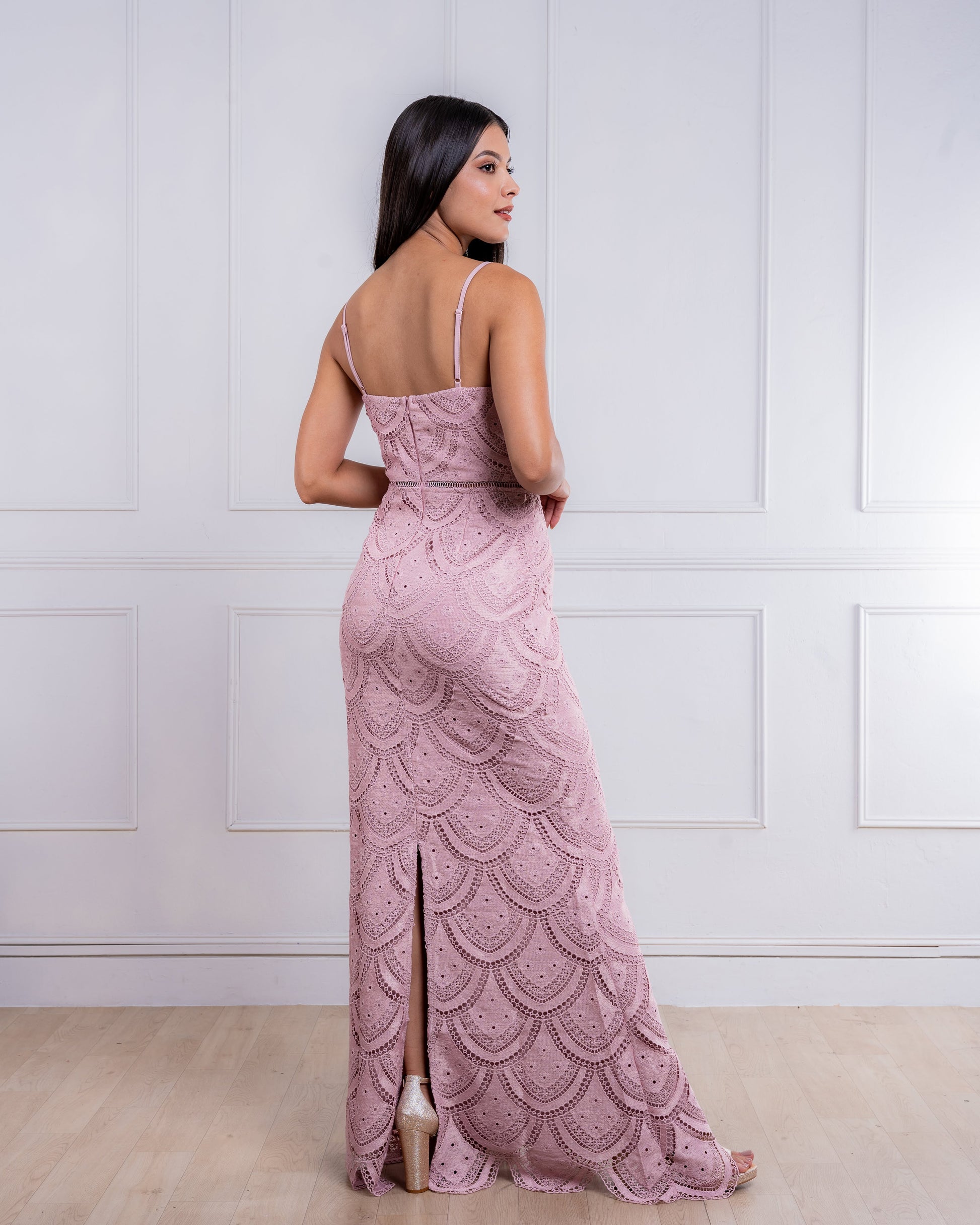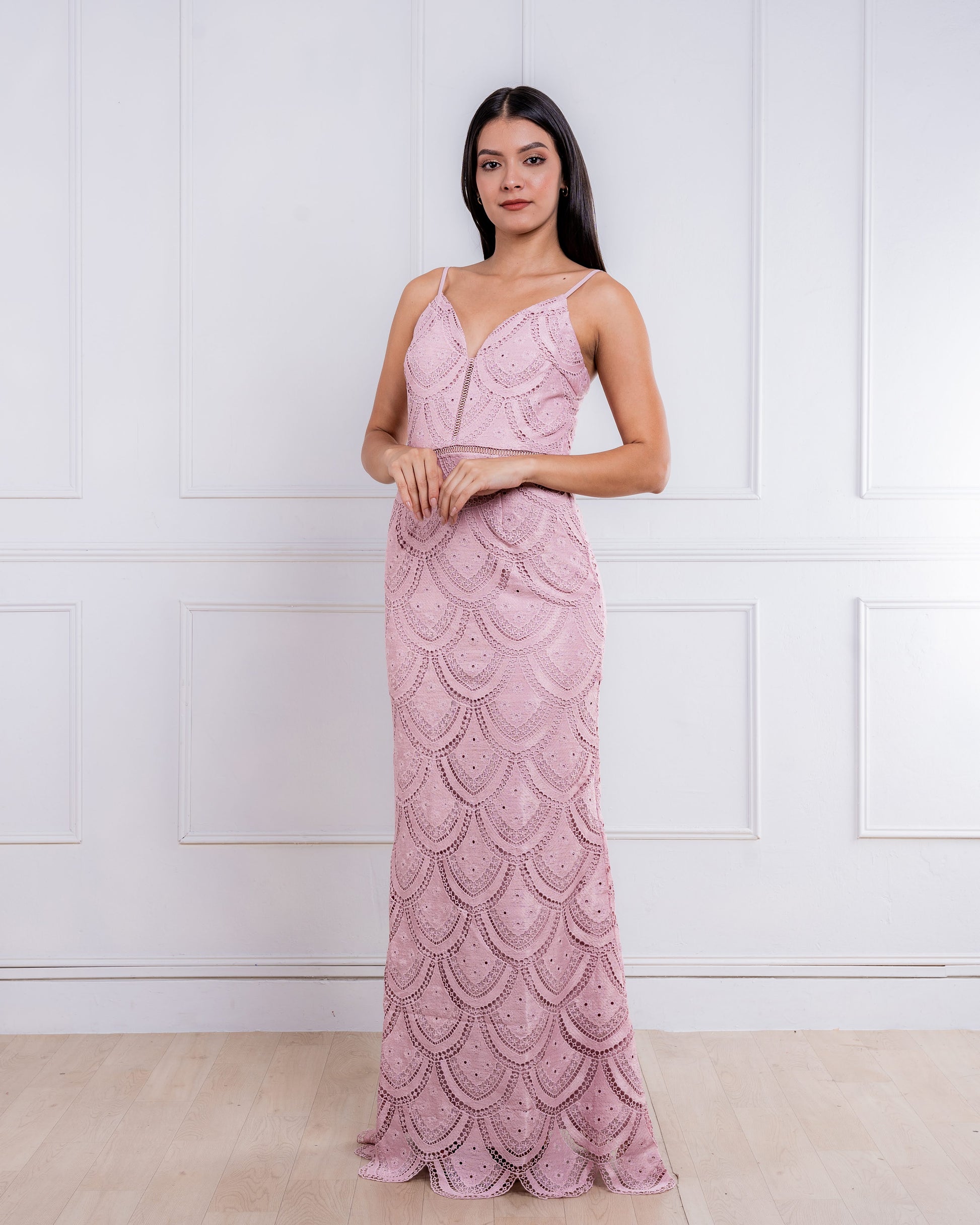 • Vestido bordado, largo de con tiras regulables y abertura posterior.