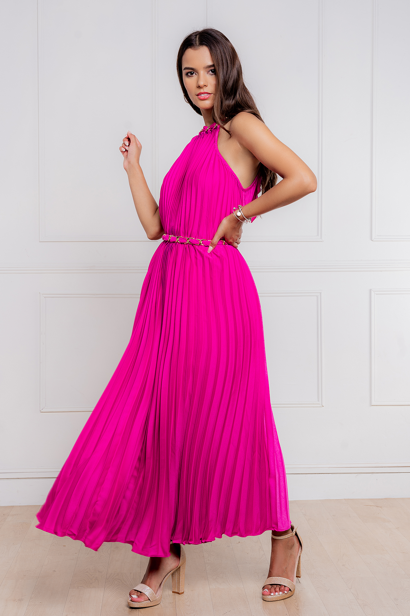• Con accesorios dorados en el cuello y cinturón