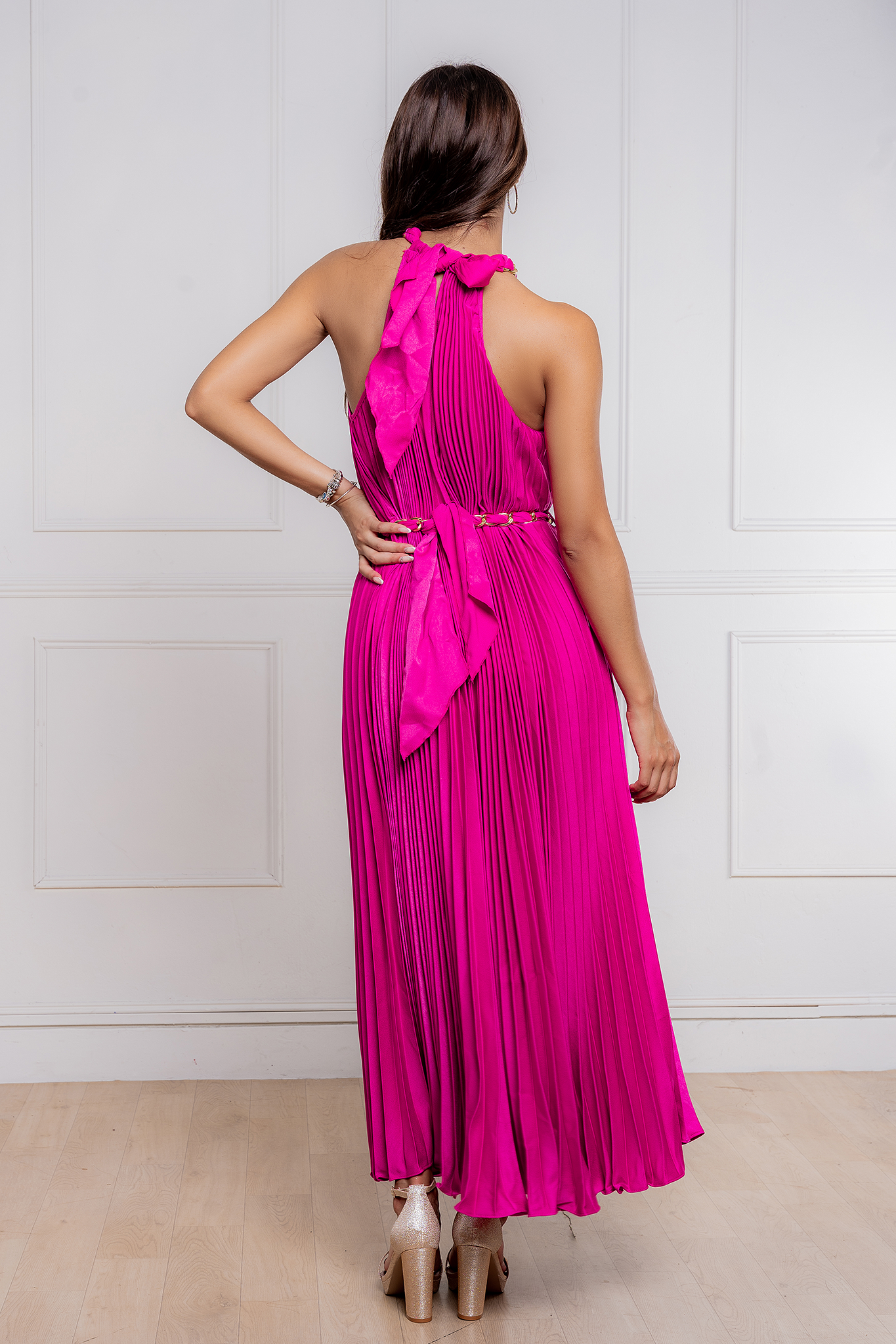 • Vestido de seda satinada plisada.
